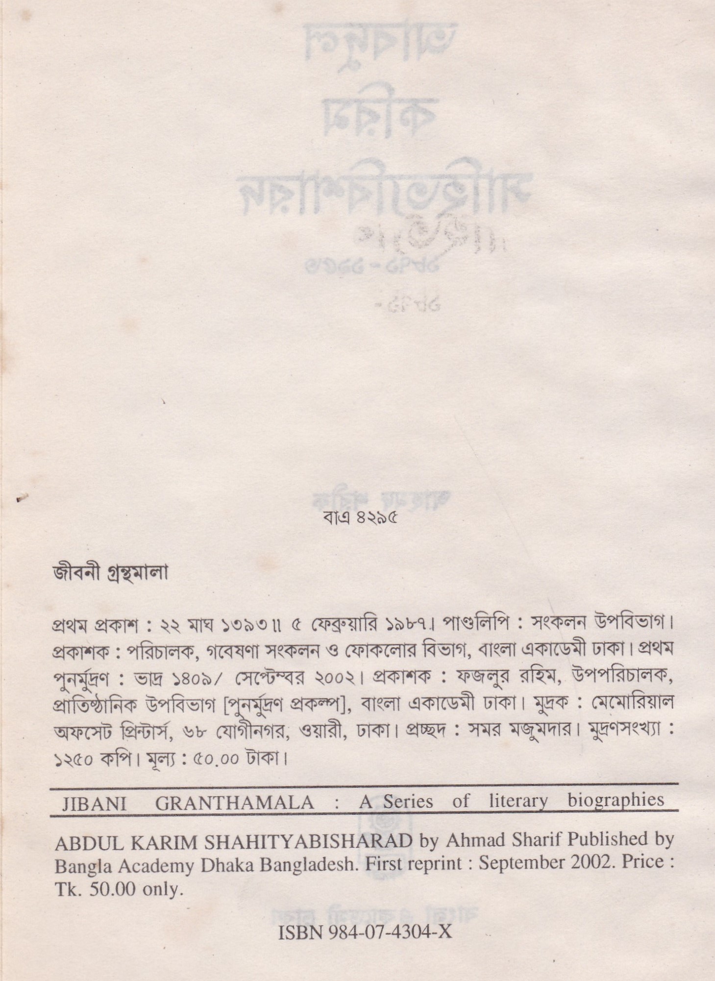 | পুন মুদ্রণ: | ১ম পুনর্মুদ্রণ : সেপ্টেম্বর ২০০২ |