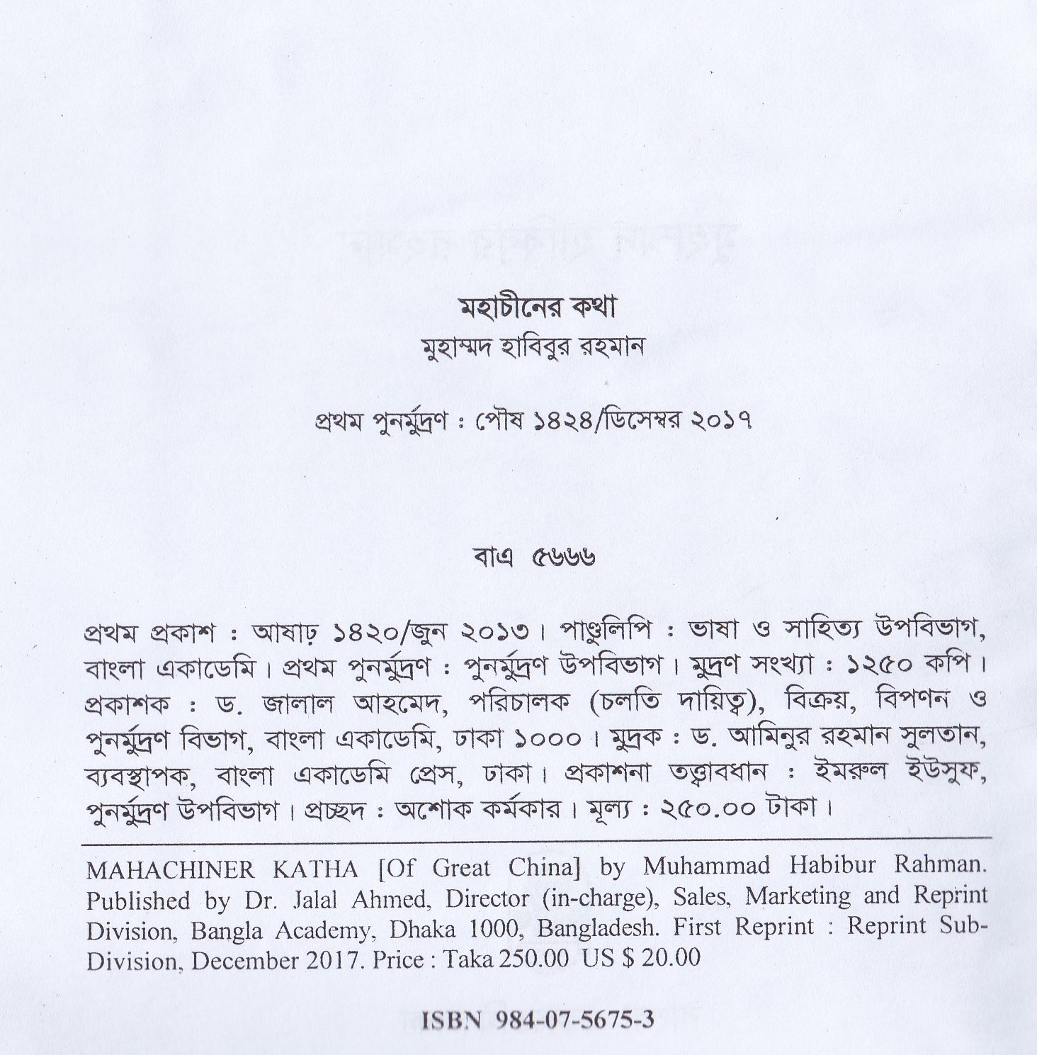 | পুন মুদ্রণ: | ১ম পুনর্মুদ্রণ : ডিসেম্বর ২০১৭ |